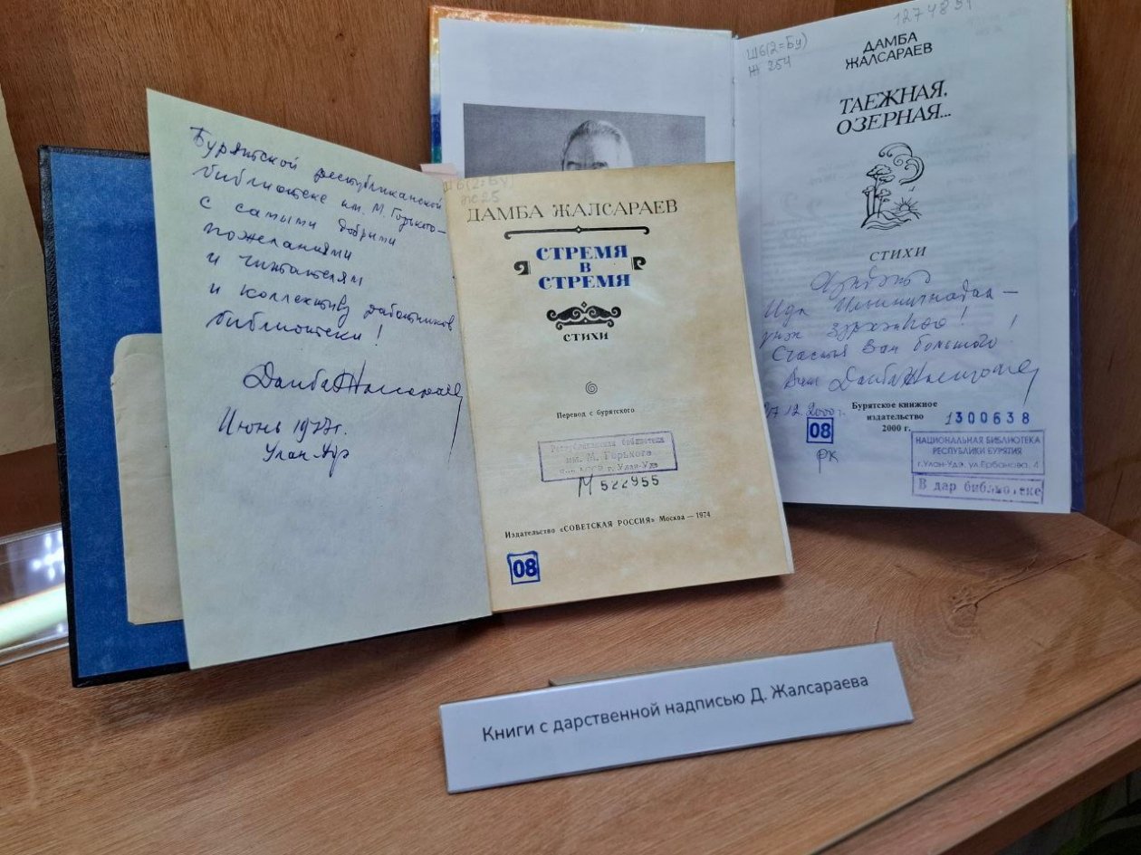 На выставке представлены рукописи и черновики стихотворений с авторскими правками, уникальные фотографии, личные и официальные документы, переписка с коллегами-писателями, а также редкие сборники стихов с дарственными надписями. Все материалы передала дочь поэта — Рада Дамбаевна Жалсараева.