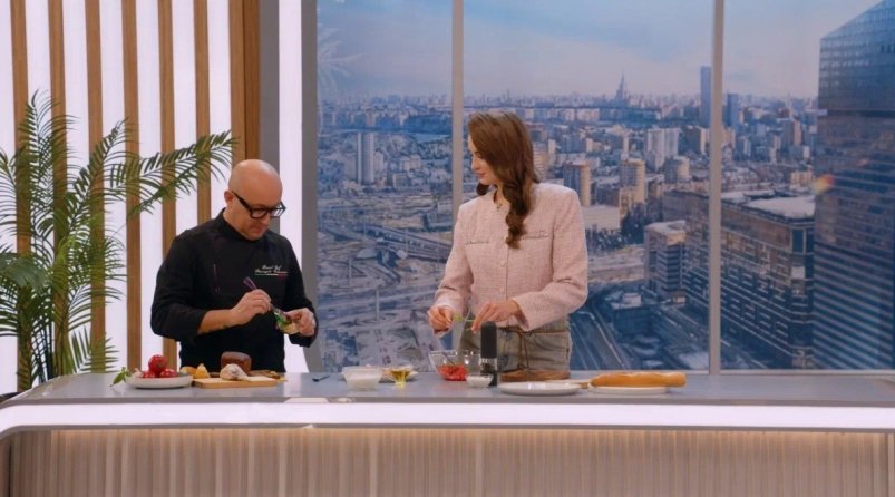 В эфире итальянец приготовил с ведущей классические брускетты, а также русский бутерброд с бородинским хлебом, горчицей и тем самым салом из Бурятии. Шеф-повар подчеркнул, что главный секрет любого блюда — готовить его с любовью.