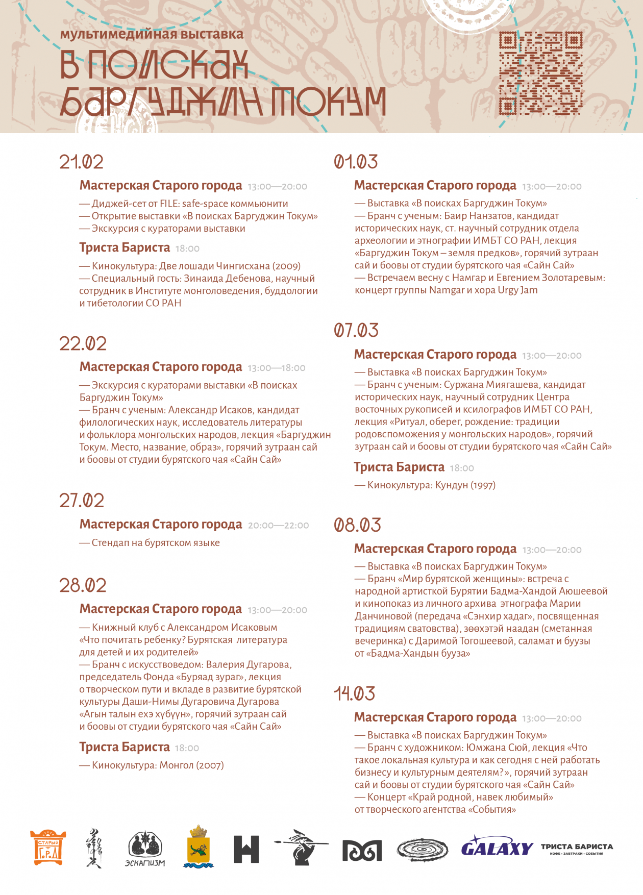 В рамках выставки пройдут бранчи с учёными и художниками. Среди спикеров — исследователь литературы и фольклора монгольских народов Александр Исаков, председатель фонда "Буряад зураг" Валерия Дугарова, археолог Баир Нанзатов, специалист по восточным рукописям Суржана Миягашева и художница Юмжана Сюй.