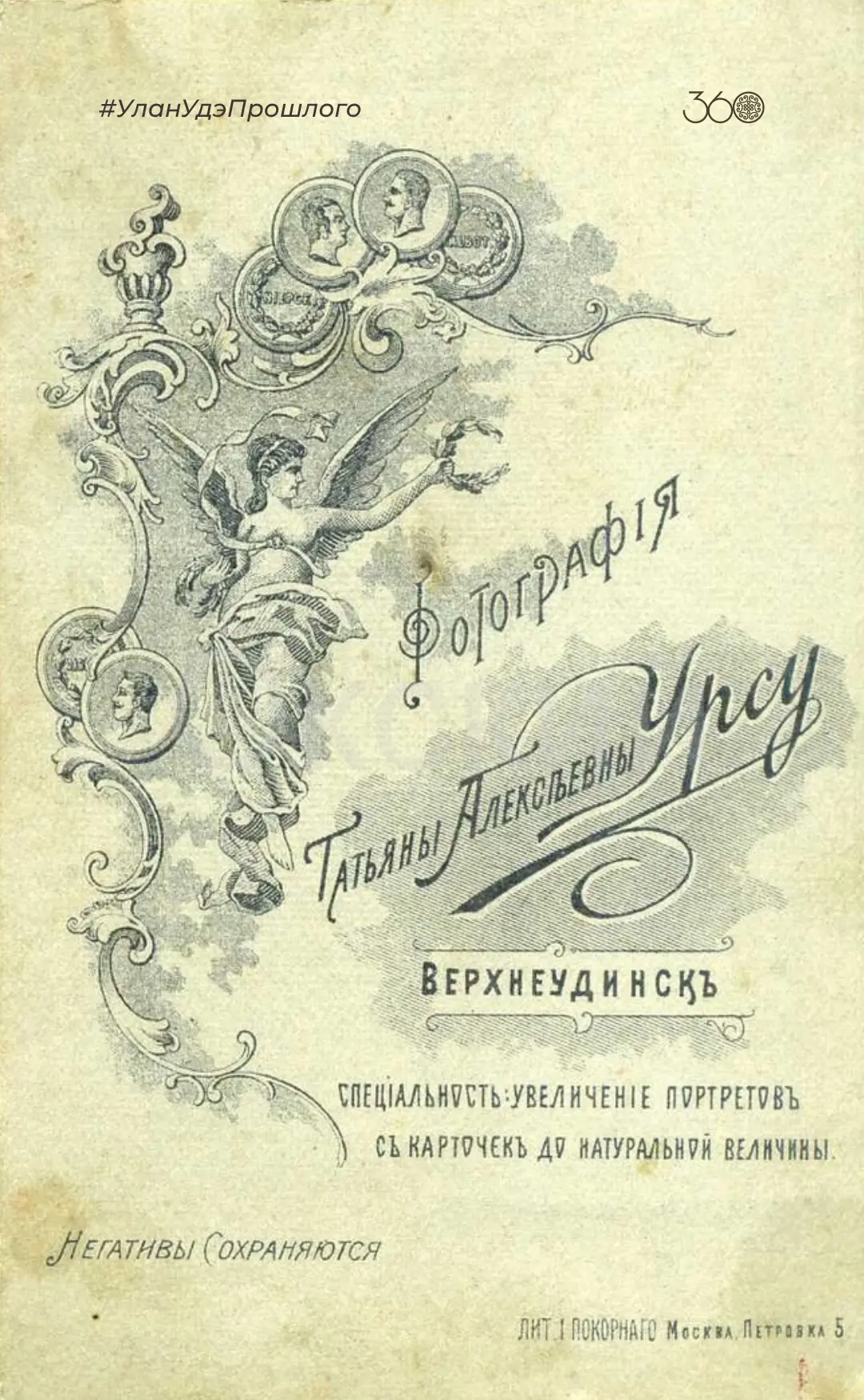 Спустя почти 40 лет, 29 марта 1910 года, в истории верхнеудинской фотографии появилось ещё одно важное имя. Фотограф Татьяна Алексеевна Урсу подала прошение в Городскую управу с просьбой разрешить открыть фотографический павильон в Нижней Березовке. Просьбу удовлетворили.