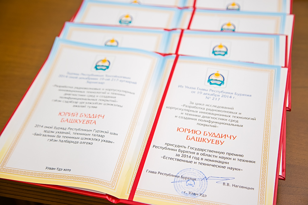В номинации "Естественные и технические науки" за цикл исследований "Разработка радиоволновых и корпускулярных инновационных технологий и техники диагностики сред и создания полифункциональных покрытий" премию присудили коллективу сотрудников Института физического материаловедения СО РАН. В составе коллектива входят профессор Юрий Башкуев, Александр Семенов, научные сотрудники лабораторий радиозондирования природных сред Павел Дагуров, Баир Доржиев, физического материаловедения - Наталья Смирнягина, электромагнитной диагностики - Валерий Хаптанов и другие. Как сообщили в министерстве образования и науки Бурятии, социально-экономический результат цикла этих научных изысканий, проведенных учеными Института физического материаловедения, достаточно широкого спектра. Например, выполнено геолокационное обследование взлетно-посадочной полосы (ВПП) и ее грунтового основания с принятием рекомендации о необходимости строительства новой ВПП. Комплекс методов и технологий совместного использования оптических и радарных изображений разработали для мониторинга лесных ресурсов. С помощью георадарного обследования обнаружили древние захоронения Фофановского могильника в Кабанском районе.