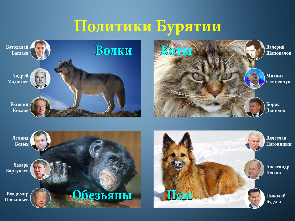 По мнению Олега Аюрзанаева, сейчас в политике, бизнесе и общественной сфере Бурятии преобладают "псы" и "обезьяны". Но маятник развития страны уже качнулся в противоположную сторону. "Демократы" были лучше приспособлены к рыночным порядкам, когда нужно искать созидать и зарабатывать. Но "аристократы" лучше умеют удерживать власть и распределять ресурсы. Поэтому в недалеком будущем следует ожидать возвращения "волков" с авторитарными порядками.