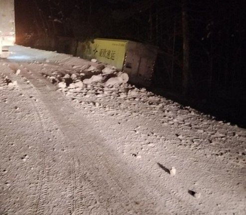 Снимок с места происшествия опубликовал паблик. На фото видно, что большегруз съехал с трассы и завалился на бок.