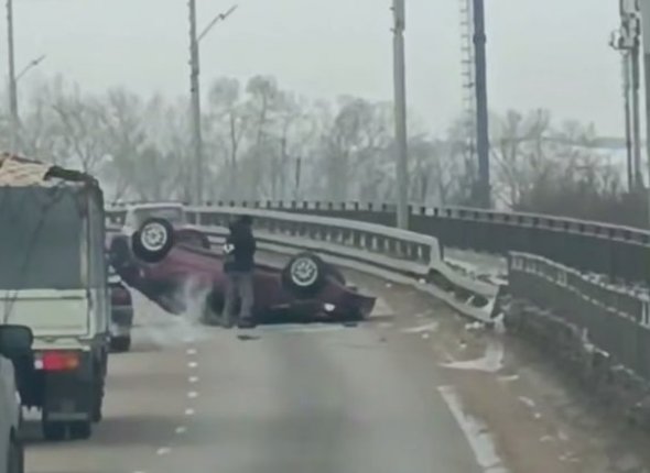 UlanMedia, 16 февраля. В Улан-Удэ на мосту "Бегущая лань" произошло ДТП, легковой автомобиль перевернулся и лег на крышу. Об этом сообщают очевидцы в паблике "Весь Улан-Удэ".