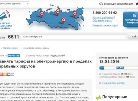 Напомним, на сайте "Российских общественных инициатив" уже почти два года ведется сбор подписей за выравнивание тарифов на электроэнергию в пределах федеральных округов. Сбор подписей активно лоббируется властями Бурятии, известны случаи прямых указаний работникам бюджетных организаций о подписании инициативы на сайте.