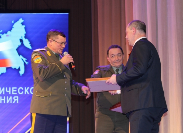 Атаман Борис Бородин вручает награду Александру Голкову. Фото: Фото: Василий Тараруев, UlanMedia