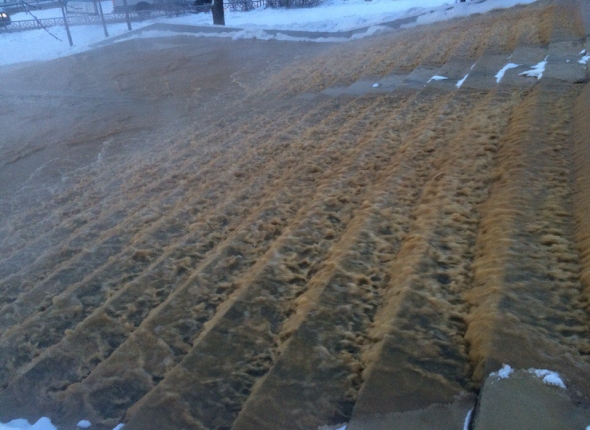 По информации пресс-службы, 2 января в 09.45 авария была устранена, ведутся работы по благоустройству на аварийном участке. На фотографиях, сделанных прохожими, и распространенными в соцсетях, видно, что лестница по театром Бурдрамы и площадка ниже обильно покрыты льдом, можно предположить, что вода вылилась и на проезжую часть, создав проблемы движению автотранспорта.