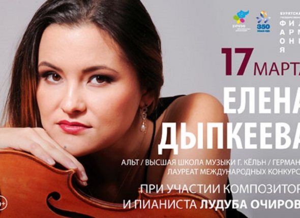 UlanMedia, 2 марта 2016. 17 марта на своей малой родине, в Улан-Удэ, даст концерт молодая талантливая альтистка Елена Дыпкеева. Сейчас выпускница Санкт-Петербургской консерватории, лауреат международных конкурсов продолжает совершенствовать мастерство в Германии, в Высшей школе музыки города Кёльн у профессора Александра Земцова. Концерт в Бурятской филармонии станет выражением признательности первым педагогам и alma mater — Республиканской специальной детской школе искусств им. Бау Ямпилова, где Елена Дыпкеева училась с шестилетнего возраста. Об этом ИА UlanMedia сообщили в пресс-службе Бурятской филармонии.